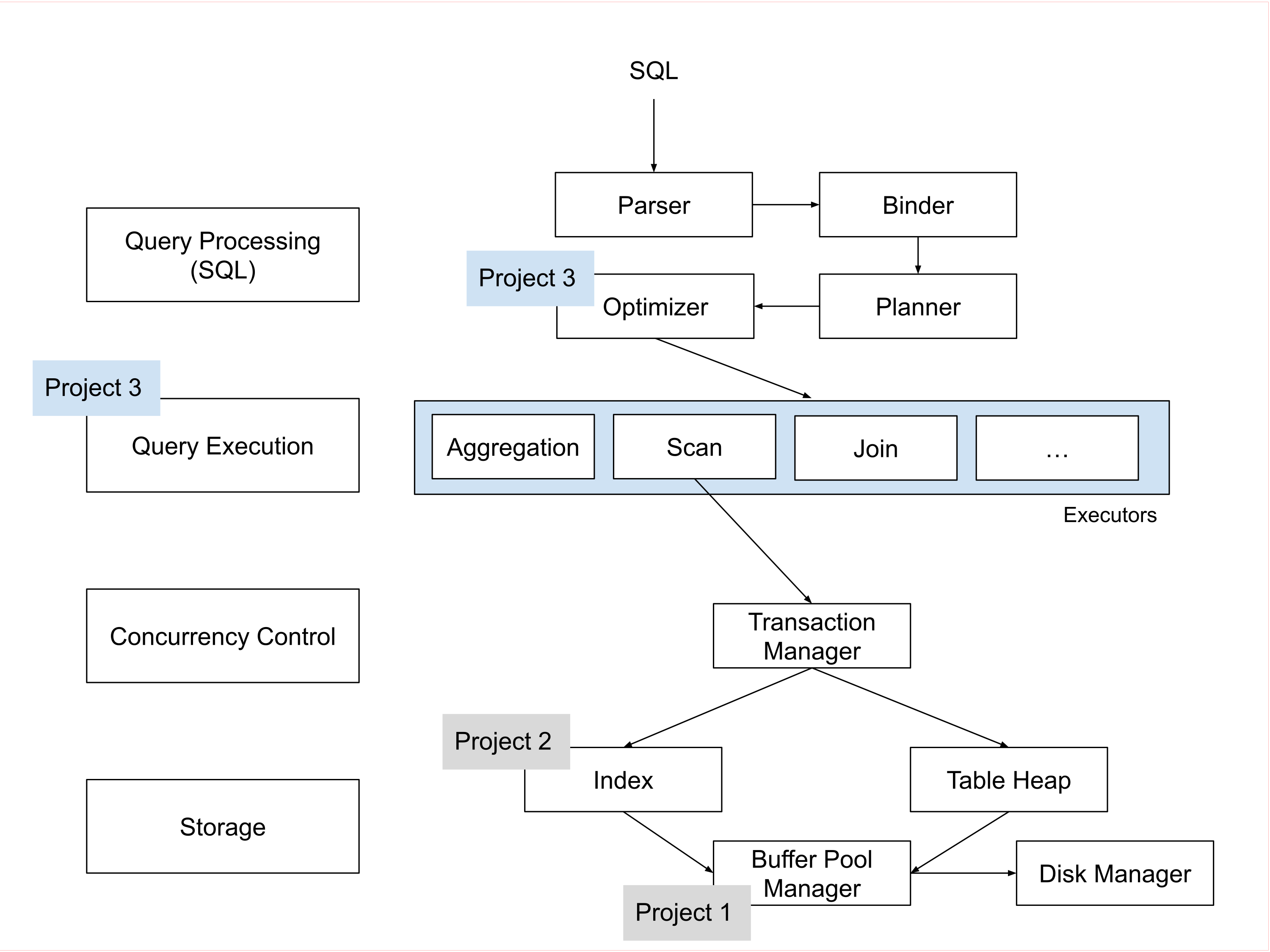 You have already implemented several internal components of a database management system. In Project #1, you implemented a buffer pool manager. In Project #2, you implemented a B+Tree index. In this project, you will implement the components that allow BusTub to execute queries. You will create the operator executors that execute SQL queries and implement optimizer rules to transform query plans.